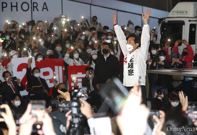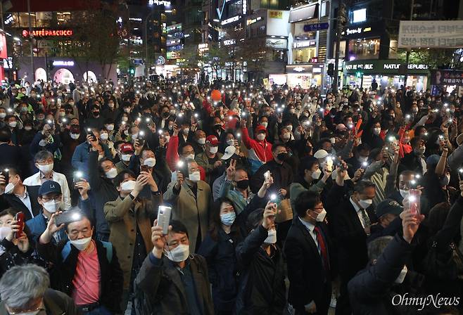 | ▲ 6일 서울 서대문구 신촌 현대백화점 유플렉스 앞에서 열린 국민의힘 오세훈 서울시장 후보 마지막 유세에서 지지자들이 휴대폰 플래시를 밝히고 있다. |