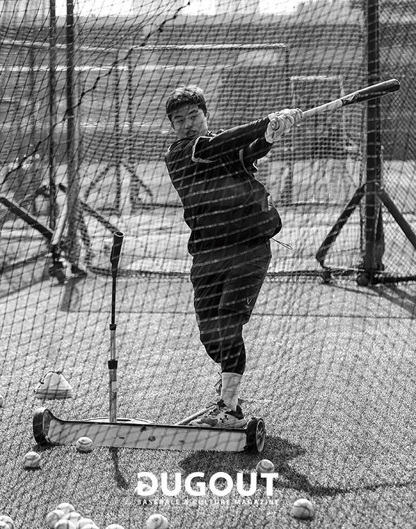 원래 루틴이 없었어요. 그저 ‘계속하면 되지’라는 생각만 했죠. 그런데 점점 풀타임으로 시즌을 나가다 보니 힘들더라고요. 이호준 코치님께서 타격 자세를 제대로 정립할 방법을 강조했어요. 코치님의 조언대로 타격 자세 정립을 위해서 시합 전에 T-배팅부터 치는 루틴이 생겼어요.