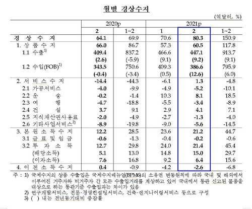 서비스 수지는 1억3천만 달러 흑자를 기록했는데, 선박 항공 운임 급등으로 운송수지가 흑자로 돌아섰고, 여행수지 적자가 1억3천만 달러 축소된 영향이 컸습니다.