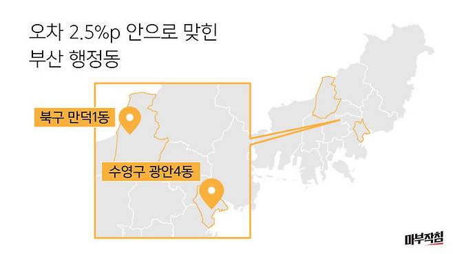 그렇다면 부산에서 가장 당선자 득표율에 가깝게 맞힌 행정동은 어디일까? 북구 만덕1동과 수영구 광안4동이었다. 이번 선거에서도 승자를 맞출 수 있을지, 이번에는 당선자 득표율과 어느 정도 격차의 득표율을 맞힐지 궁금하다. 오늘 선거의 승자는 밤늦게 가려질 것으로 예상된다. 서울과 부산 풍향계 행정동들의 개표 데이터 결과가 기다려진다.