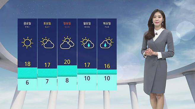 내일 아침 기온 서울이 6도에서 출발하면서 오늘보다는 2도가량이 낮겠고요, 낮 기온도 오늘보다 2~4도가량이 낮겠습니다.
