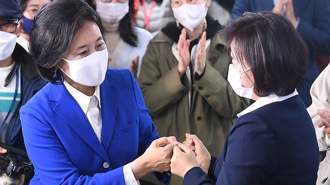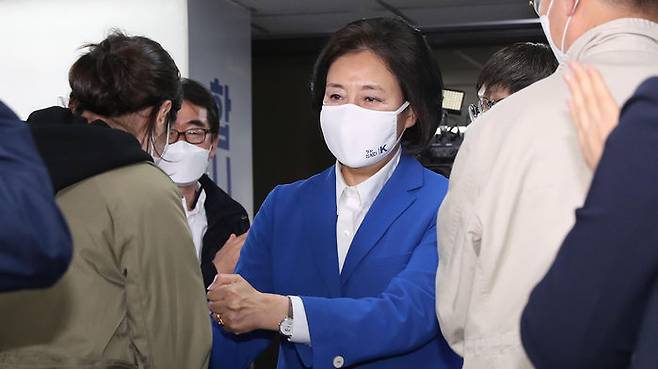 4·7 재보궐선거 더불어민주당 박영선 서울시장 후보가 7일 밤 서울 종로구 안국빌딩 선거캠프를 찾아 캠프 관계자들과 인사를 나눈 뒤 캠프를 떠나고 있다.