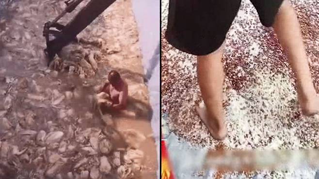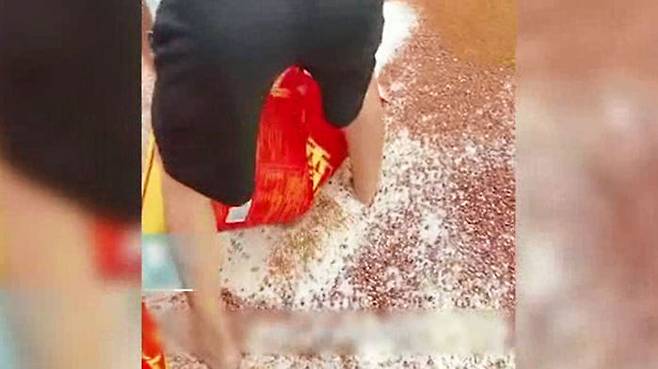 얼마 전 알몸으로 배추를 절이는 영상으로 논란이 됐던 중국에서 이번에는 맨발로 잡곡을 섞는 영상이 공개돼 충격을 주고 있습니다.