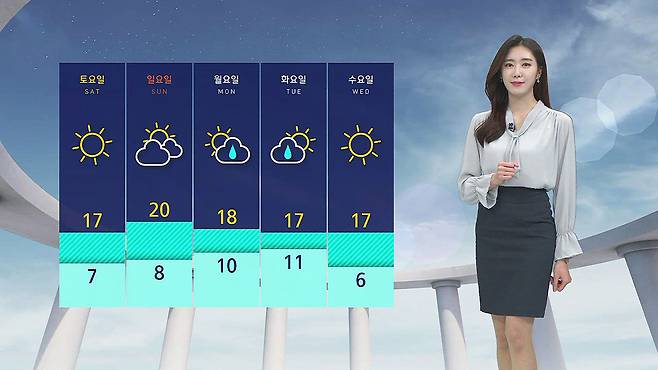 아침 기온은 서울이 7도로 오늘과 비슷하거나 조금 낮게 출발하겠고요, 낮 기온은 서울이 18도, 대구 14도, 부산 15도로 동쪽 지역은 다소 낮아지겠습니다.