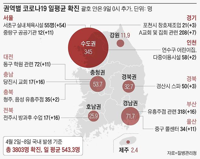8일 기준 부산에선 유흥 주점 35곳과 직업 소개소 6곳을 중심으로 확진자가 233명 발생했고, 사하구 목욕탕과 헬스장 이용자 61명이 무더기로 감염됐다. 서울에선 서초구 체육관 이용자와 직원, 이들의 가족까지 55명이 집단감염됐다. 인천 연수구 어린이집에서도 교사와 어린이 36명이 확진받았고, 대전 동구에선 학원 1곳을 매개로 학생과 가족 등 72명이 줄줄이 감염됐다.