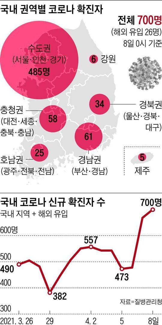 국내 코로나 새 확진자가 8일(0시 기준) 700명을 기록하면서 ‘4차 대유행 현실화’ 우려가 커지고 있다. 정부도 8일 “4차 유행 진입”이라는 표현을 썼다. 2월 중순 이후 하루 확진자가 300~400명대로 지속됐지만 지난주부터는 5일 연속 500명대로 올라선 데 이어 7~8일엔 668명, 700명으로 증가했다. 전문가들 사이에선 “최악으론 곧 하루 확진자가 2000명까지 급증할 수 있다”는 경고까지 나오고 있다.