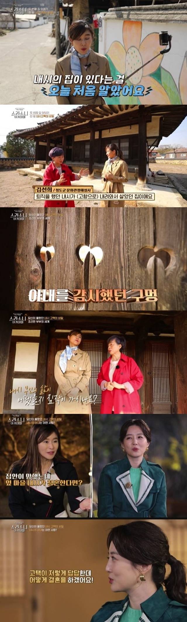 운림고택은 바깥이 전혀 안 보이는 안채 구조와 아내를 감시하기 위해 뚫어놓은 세 개의 구멍이 눈길을 끌었다. 예지원이 “과거 몰락한 집안을 일으켜 세우기 위해 내시와 결혼하는 양반가 규수들이 있었는데, 만약 본인이 그런 상황이라면 어떻게 했을 것 같냐”고 묻자 김소영은 “고택이 저렇게 답답한데 어떻게 결혼을 하겠냐”며 “내시한테 콤플렉스가 없어야 한다. 성격이 중요하지 않을까?”라고 말했다. 예지원이 “저 시대에는 남편 성격을 미리 알 수 없다. (시집)가서 봐야 한다”고 하자 김소영은 “성격을 모르면 결혼할 수 없다”고 못박아 웃음을 안겼다. (사진=MBN 교양 '아는척쌀롱-스라소니 아카데미' 캡처)