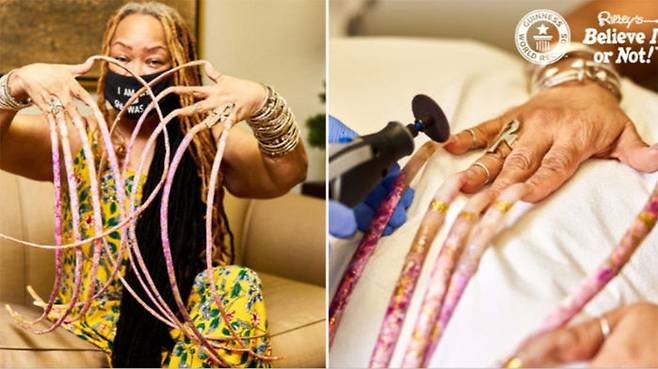 미국 텍사스주의 한 여성이 28년 동안 손톱을 7m까지 길러 기네스 기록을 세운 뒤 소형 전기톱을 사용해 손톱을 잘라냈습니다.