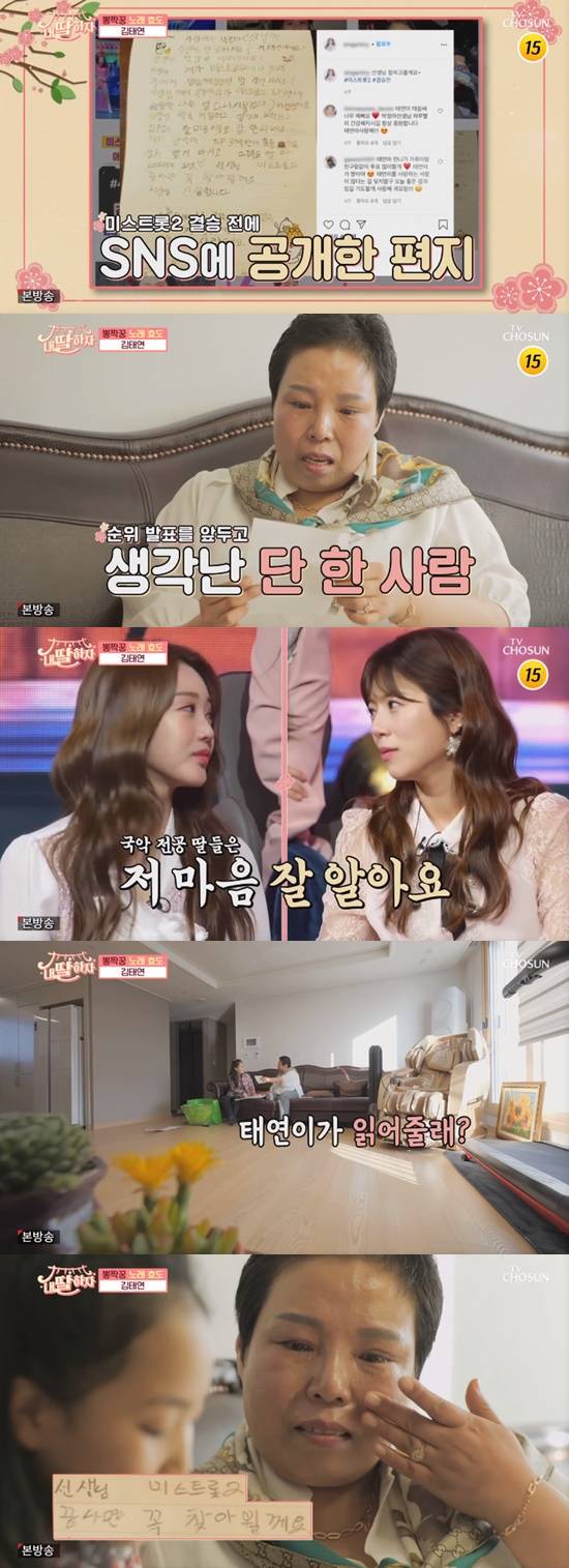 김태연은 박정아를 위해 손편지를 준비하기도 했다. 박정아는 편지를 펼치자마자 눈물을 흘렸다. 양지은과 홍지윤은 "선생님과의 관계를 알기 때문에 마음이 더 이상하다"고 공감했다. 박정아는 "태연이가 선생님에게는 항암제보다 큰 역할을 했다"고 말했다. 김태연은 박정아를 위해 장민호의 '남자는 말합니다'를 '태연이는 말합니다'로 개사해 열창했다.