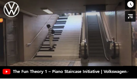 [ https://www.youtube.com/watch?v=SByymar3bds&t=5s&ab_channel=Volkswagen ]*2009년 폭스바겐이 스웨덴에서 실시한 실험이 '좋은 습관 사회화'의 좋은 예가 될 수 있습니다. 지하철 계단을 피아노 건반의 소리가 나게 바꾼 결과, 평소보다 66% 더 많은 사람들이 에스컬레이터 보다 계단을 사용했습니다.