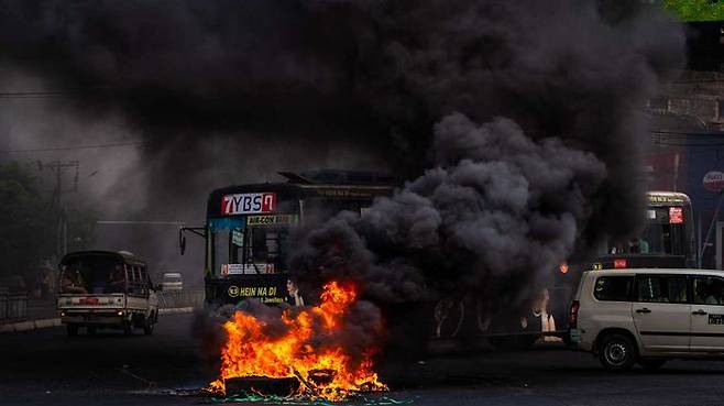 ▲ 쿠데타 반대 시위대에 의해 불이 붙은 타이어