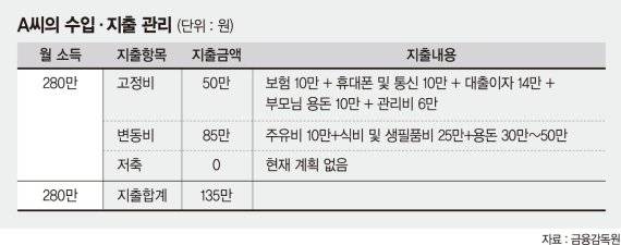 A씨의 월 소득은 세후 280만원이고 연간 기타 소득은 640만원이다. 한 달 동안 나가는 고정비는 보험(10만원)과 통신비(10만원), 대출이자(14만원), 부모님 용돈(10만원), 관리비(6만원) 등 모두 50만원이다.