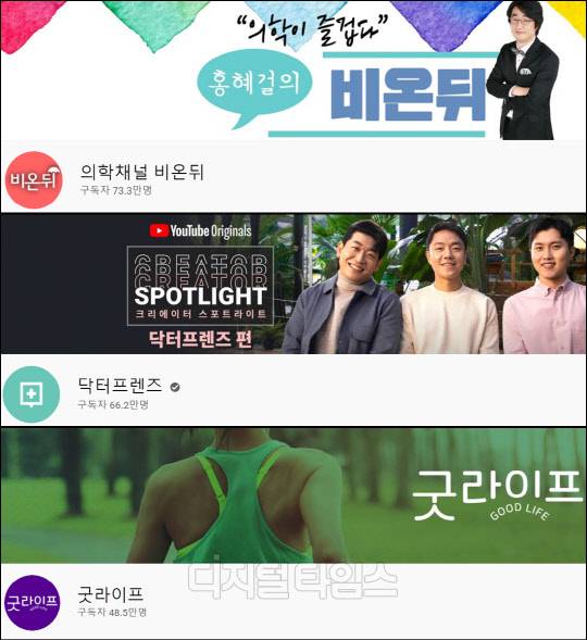 이 외에 △피부과 의사 오가나의 채널 '오프라이드' (4위, 35.8만 명) △치과 의사 이수진의 채널 '이수진' (5위, 15.8만 명) △산부인과 의사들이 모여 만든 채널 '우리동네 산부인과, 우리동산' (6위, 16.3만 명) △정신과 의사 형제의 채널 '양브로의 정신세계' (7위, 12.9만 명) △젊은 정신과 의사들이 운영하는 채널 '뇌부자들' (8위, 8.7만 명) △다양한 분야의 의사들이 참여하는 채널 '나는 의사다' (9위, 7.6만 명) △가정의학과 및 내과 의사 부부의 채널 '닥터언니'(10위, 5.9만 명) 채널이 상위 10위 내에 포함됐다.