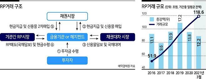 국내 환매조건부매매(RP·Repurchase agreement) 시장 규모가 지난해 처음으로 100조원을 넘어섰다. 국내 RP시장은 단기차익을 노린 투기적 수요가 대부분이어서 만기불일치에 따른 유동성 위험이 크다는 우려가 많았다. 금융위원회가 이를 개선하기 위해 지난해 새로운 규제를 도입했음에도 효과가 미미했다는 게 한국은행의 지적이다.