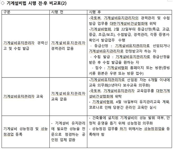 국토부는 기계설비법 시행 이전에 이미 기계설비 유지관리 업무를 수행하고 있던 사람에게는 5년의 유예기간을 줘 자격 준비 기간을 갖도록 했다.