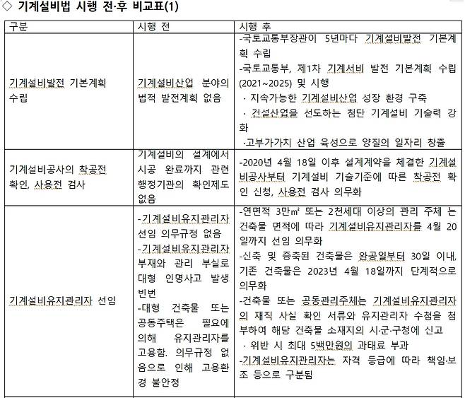 ▶기계설비공사의 착공전 확인 신청, 사용전 검사=기계설비공사를 발주한 자는 특별자치시장·특별자치도지사·시장·군수·구청장에게 해당 공사를 시작하기 전에는 기계설비 설계도서를 제출해 기술기준에 적합한지를 확인받아야 한다. 또 그 공사를 끝냈을 때는 사용 전 검사를 받아야 한다. 착공 전 확인을 받지 않고 기계설비공사를 발주하거나 사용 전 검사를 받지 않고 기계설비를 사용한 자 등은 1년 이하의 징역 또는 1000만원 이하의 벌금이 부과된다. 기계설비의 착공 전 확인 신청은 2020년 4월 18일 이후 설계계약을 체결한 기계설비공사부터 적용된다. 이에 따른 구체적인 기계설비 기술기준은 국토부가 조만간 고시할 예정이다.