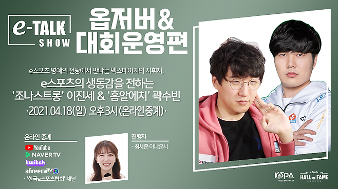한국e스포츠협회가 운영하는 e스포츠 명예의 전당은 오는 18일(일) 12번째 'e-토크쇼'에 e스포츠 옵저버와 대회 운영 담당자를 초대해 직업적 궁금증을 풀어낼 예정이라고 13일(화) 밝혔다.