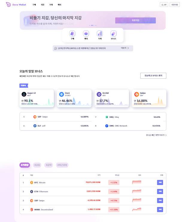 이번 홈페이지 개편은 편의성 향상에 중점을 뒀다. 구매, 예치, 거래, 일일보너스 등 대표 금융서비스들을 상단에 배치, 관련 혜택들을 빠르게 확인할 수 있도록 했다.
