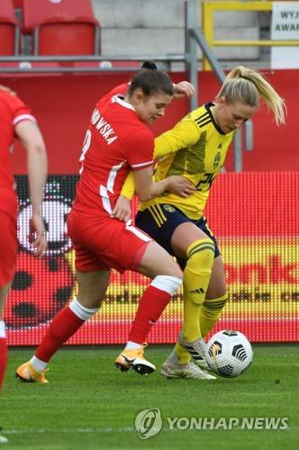 epa09133206 Martyna Wilankowska (L) (L) of Poland and Rebecka Blomqvist (R) of Sweden in action during the International friendly women's soccer match between Poland and Sweden at the City Stadium in Lodz, Poland, 13 April, 2021. EPA/GRZEGORZ MICHALOWSKI POLAND OUT