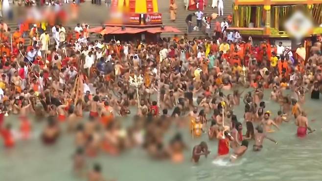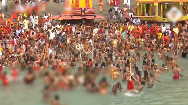 현지 경찰에 따르면 이날 아침에만 최소 65만 명이 갠지스강에서 집단 목욕을 즐겼는데요, 화면 보시는 것처럼 말 그대로 물 반 사람 반에 대부분 마스크도 쓰지 않았습니다.