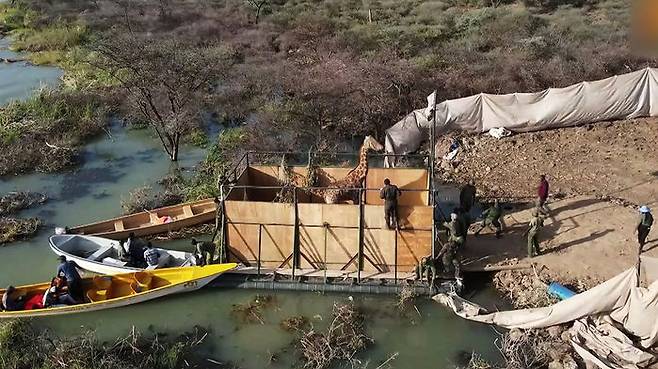호수의 수위가 점점 차오르면서 구조가 시급한 상황이 되었고요, 지난해 12월 케냐의 야생동물보호단체가 강철과 드럼통으로 바지선을 만들어서 기린을 안전한 곳으로 옮기기 시작했습니다.