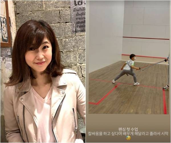 강수정은 14일 오전 자신의 인스타그램 스토리에 "펜싱 첫 수업 칼싸움을 하고 싶다며 배우게 해달라고 졸라서 시작"이라는 글과 함께 한 장의 사진을 게재했다.