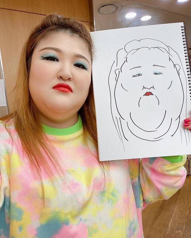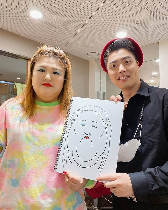 공개된 사진 속 이국주는 하준수와 그림이 담긴 스케치북을 들고 포즈를 취하고 있다. 해당 그림은 하준수가 그린 것으로 보이는 이국주의 캐리커처. 같은 색상의 메이크업 색조와 통통한 얼굴을 강조해 포인트를 살리며 웃음을 자아냈다.