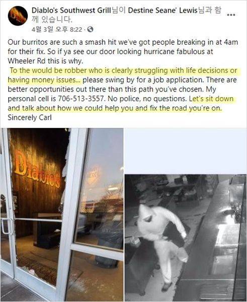 이어 "당신이 선택한 길(범죄)보다 나은 기회들이 있다는 것을 알려주고 싶다. 경찰에 신고하지 않을 것이고, 그 어떤 질문도 하지 않겠다. 마주 앉아 당신이 어떤 도움을 받을 수 있을지 함께 생각해보자"며 자신의 연락처를 남겼습니다.