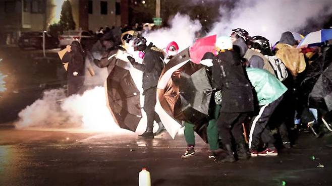 오리건주 포틀랜드에서는 시위대가 경찰 노조 빌딩에 불을 지르는 일까지 벌어지면서 경찰이 폭동 진압을 선포해 긴장감이 높아지고 있습니다.