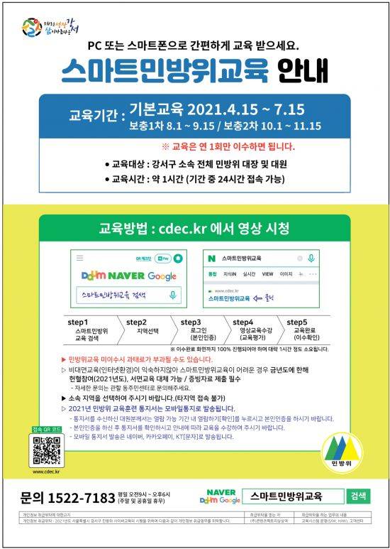 구 소속 민방위 대장과 대원은 4월15일부터 7월15일까지 스마트폰 또는 PC를 활용, ‘스마트민방위교육 홈페이지’에 접속해 수강하면 된다.