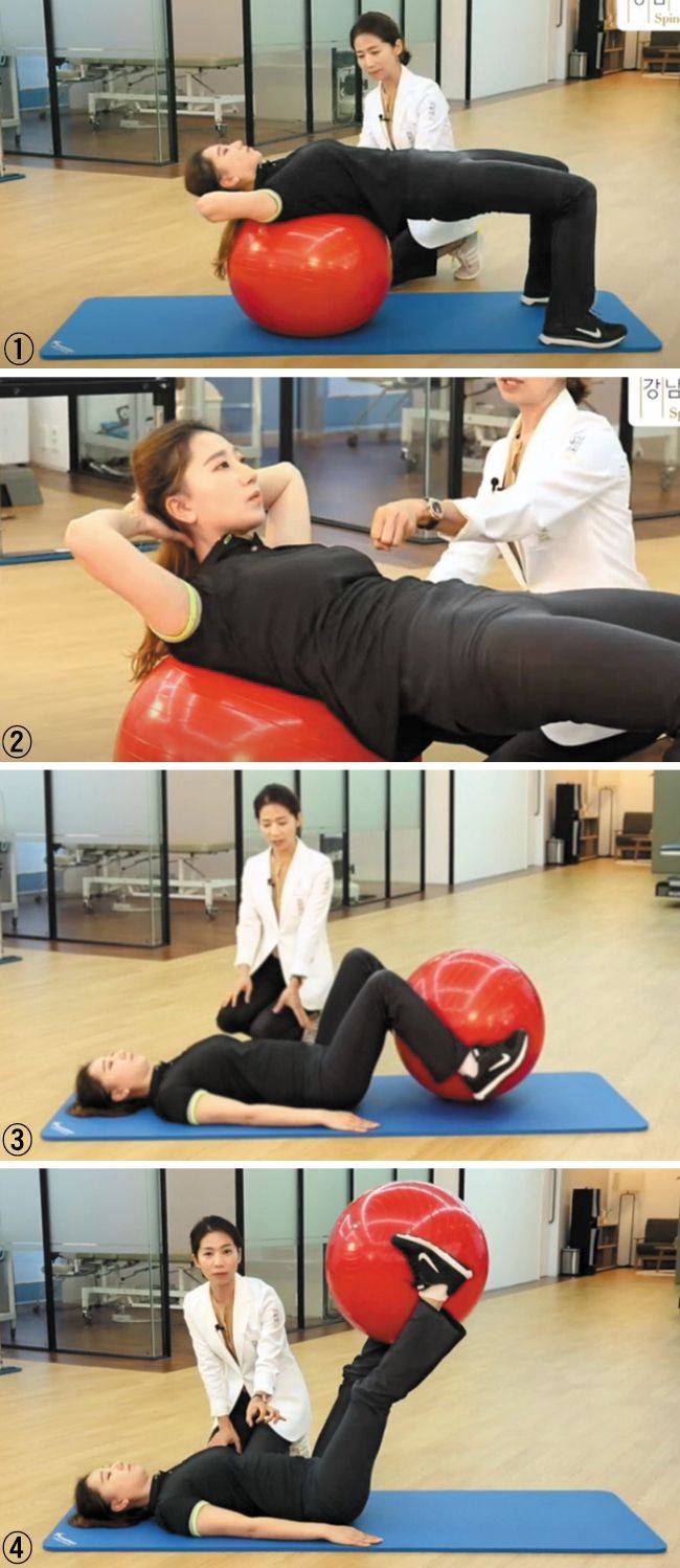 세워둔 짐볼에 어깨 부분을 대고 무릎은 90도로 굽힌 뒤 세워준다. 몸의 모양이 기역(ㄱ)자 모양이 된다. 짐볼이나 몸이 흔들리지 않도록 배·엉덩이·허벅지에 힘을 주고 균형을 잡아준다(그림①). 이 상태에서 목을 보호하기 위해 양손을 머리 뒤에 받치고 머리부터 날개뼈 부분까지 차례차례 45도 각도로 올려준다(그림②). 상복부를 강하게 수축시키면서 엉덩이 아래와 허벅지에도 힘을 준다. 엉덩이가 아래로 처져 기역자 모양이 무너지지 않도록 한다. 같은 자세를 5~10번 반복한다. 다음 동작은 바닥에 누운 뒤 짐볼을 양쪽 발목 사이에 끼운 자세에서 시작한다. 무릎을 구부려 발목 사이 짐볼을 엉덩이 아래까지 끌고 왔다가(그림③), 다리를 하늘로 펴준다(그림④). 올렸던 다리를 다시 바닥으로 내려준다. 허리가 바닥에서 뜨지 않도록 주의한다. 허리에 통증이 느껴지지 않는다면 같은 동작을 5~10번 반복하면 상복부와 하복부를 동시에 자극할 수 있다.
