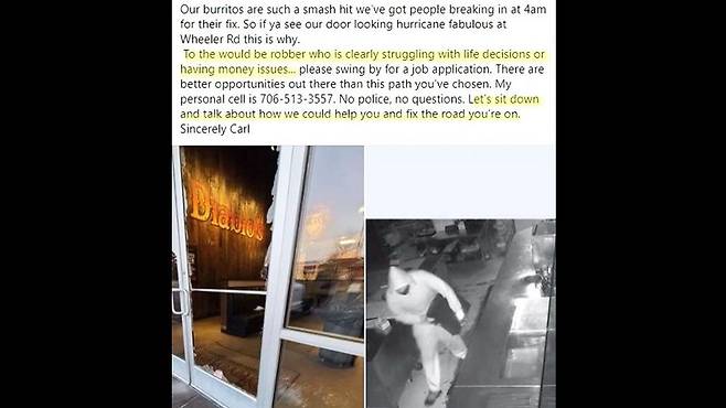가뜩이나 코로나19로 가게 상황이 어려웠기 때문인데요, 하지만 마음이 진정될수록 범인에 대한 안타까움이 커졌고 결국 자신의 SNS에 범인의 모습을 공개하면서 일자리를 주고 싶다며 자신의 연락처를 남겼습니다.