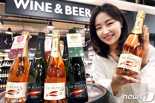 (서울=뉴스1) = 15일 서울 등촌동 홈플러스 강서점에서 모델이 스페인 까바(Cava) 스파클링 와인 2종을 선보이고 있다.