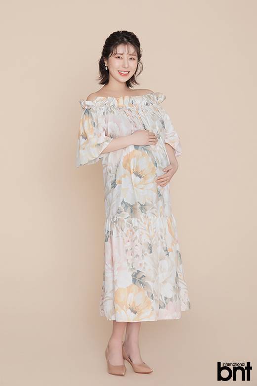 그는 이번 화보 촬영에서 만삭에도 여전히 아름다운 외모를 자랑했다. 단정한 블랙 수트 세트업에 청순한 매력을 발산하는가 하면 플라워 원피스에 상큼한 미소를 더하며 사랑스러운 모먼트를 뽐내 보였다. 이어 라인이 돋보이는 오프 숄더 드레스로 고혹적인 실루엣을 과시했다.