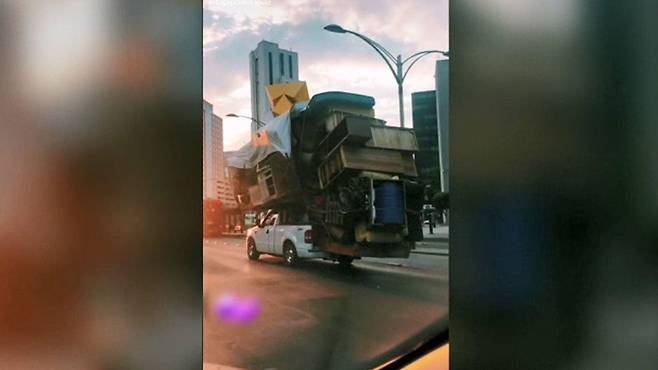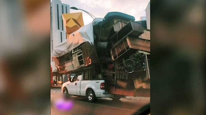 마치 집 한 채를 통째로 올려놓은 것 같은데요, 차체보다도 훨씬 더 큰 이삿짐을 싣고 휘청거리며 달리는 모습이 상당히 위험해 보입니다.