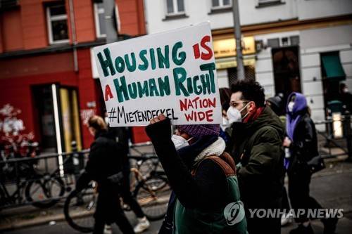 epa09137882 People protest against the German Federal Constitutional Court's ruling on Berlin's rent cap law 'Mietendeckel', in Berlin, Germany, 15 April 2021. The German constitutional court on 15 April 2021 ruled that the Berlin state?s rent cap law was not in line with the federal constitution. EPA/FILIP SINGER