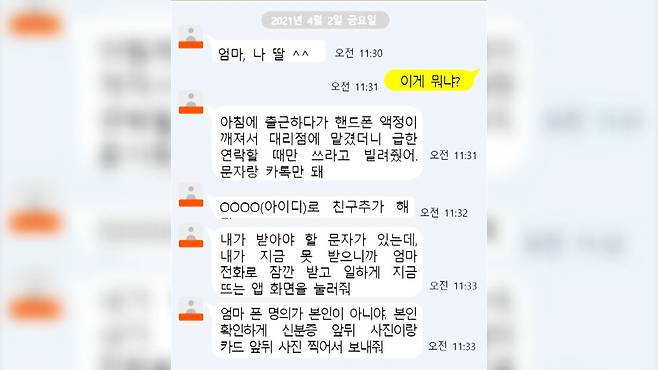 피싱 그놈의 수법 "엄마, 나 딸^^ 핸폰 잃어버림ㅠ"