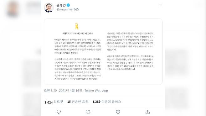 문 대통령은 오늘(16일) 자신의 소셜미디어를 통해 '세월호의 기억으로 가슴 아픈 4월입니다'라는 제목의 글을 올렸습니다.