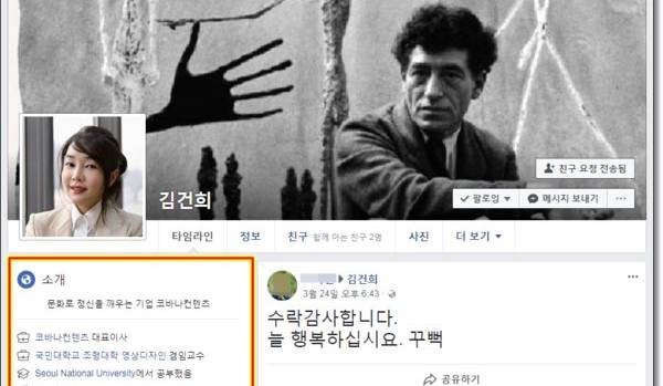 | ▲ 김건희씨의 페이스북. 자신이 '서울대에서 공부'했고, '국민대 조형대학 영상디자인학과 겸임교수'를 지냈다고 소개했다. |