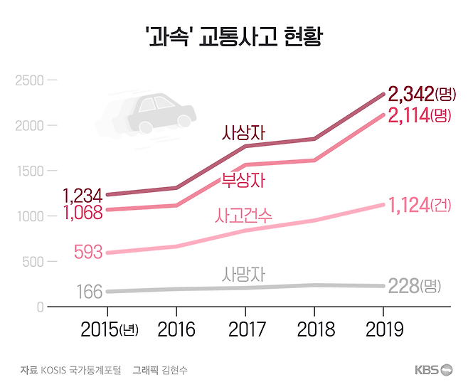 2015년 593건이던 과속으로 인한 교통사고는 매년 늘어 2019년 1,124건으로 두 배 가까이 증가했습니다. 과속으로 인한 인명피해도 크게 늘었는데, 2015년 1,234명이던 사상자 수가 2019년에는 2,342명으로 역시 배 가까이 늘었습니다.