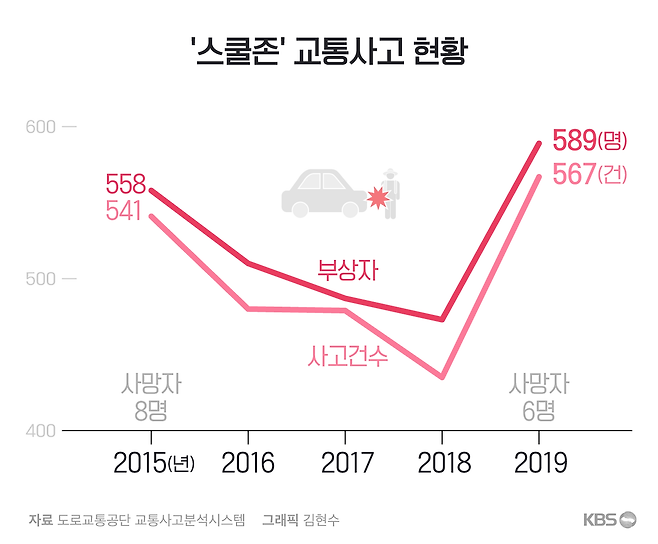 매년 조금씩 줄어들던 어린이보호구역 사고가 2019년 급증했습니다. 한해 사이 사망자는 2배, 부상자도 25% 가까이 늘었습니다. 사고가 날 때마다 큰 주목을 받고 있지만, 정작 사고 건수나 인명피해는 크게 줄지 않고 있는 것도 특징입니다.