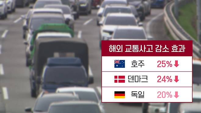 여기에 해외 사례도 정부의 주장을 뒷받침하고 있습니다. 우리나라보다 빨리 도심부 제한 속도를 시속 50km로 줄인 호주는 25%, 덴마크와 독일은 각각 24%와 20% 씩 사고가 줄었습니다.