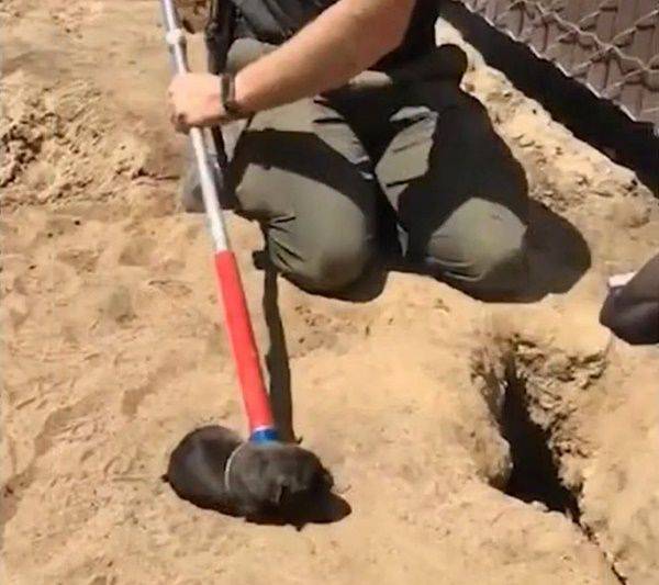 메시스 씨는 기다란 집게를 동원해 구조 작업에 나섰습니다. 바닥에 바짝 엎드린 뒤 구멍에 머리를 집어넣고 흙을 파내며 고군분투한 끝에 까만 털을 가진 강아지 한 마리를 굴 밖으로 끄집어낼 수 있었습니다.