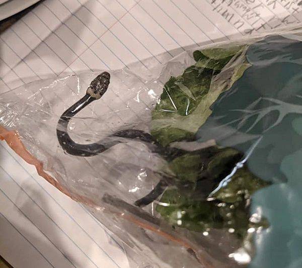 의아해하며 구매한 물건들을 살펴보던 두 사람은 양상추 봉지 안에 있던 무언가와 눈이 마주쳤습니다. 혀를 날름거리며 봉지 안을 꿈틀거리는 뱀 한 마리였습니다. 약 20cm 길이의 뱀은 인기척을 느끼자 더욱 활발하게 쉭쉭 소리를 내며 양상추 사이를 헤집고 다니기 시작했습니다.