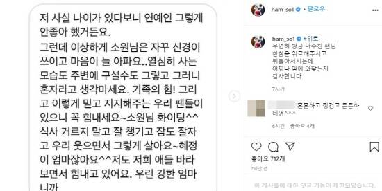 누리꾼은 "나이가 있다보니 연예인 그렇게 안 좋아했다. 그런데 이상하게 소원님은 자꾸 신경이 쓰이고 마음이 늘 아프다. 열심히 사는 모습도 주변에 구설도 그렇고 그러니 혼자라고 생각하지 말라. 가족의 힘, 그리고 이렇게 믿고 지지해주는 팬들이 있으니 힘내세요. 파이팅"이라며 위로했다.