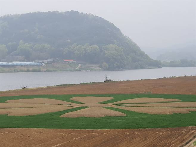 "초록색은 청보리과의 누리 찰보리를 심은 거예요. 꽃잎 부분은 코스모스를 심은 거고요. 부여 구드래가 코스모스 관광 명소로 유명하잖아요. 그래서 직경 70미터의 거대 코스모스 꽃잎을 형상화해서 심은 거예요."