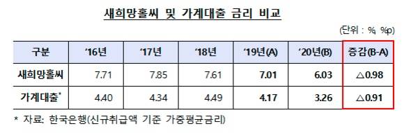 지난해 새희망홀씨 평균금리는 6.03%로 전년 대비 0.98%포인트 하락했다. 같은 기간 가계대출 평균금리가 3.26%였는데, 2.77%포인트 차이났다.