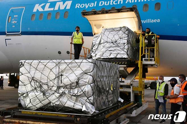 (에세이사 AFP=뉴스1) 우동명 기자 = 18일(현지시간) 아르헨티나 부에노스아이레스의 에세이사 국제공항에서 인도산 아스트라제네카 백신(코비실드)이 하역되고 있다.