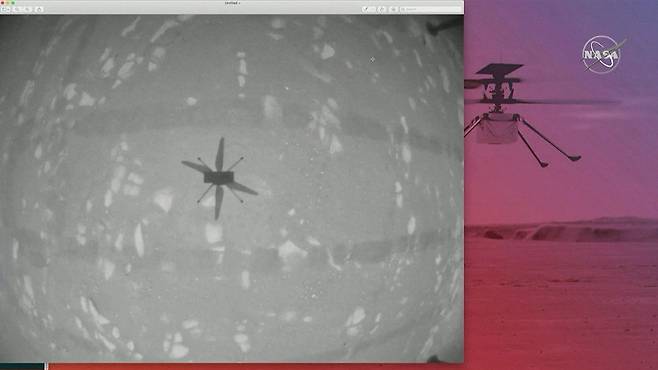 미국 현지시간 19일 새벽 3시 반쯤, 미 항공우주국 나사가 개발한 우주 헬기 '인저뉴어티'가 화성에서 첫 동력 비행에 성공하는 모습입니다.