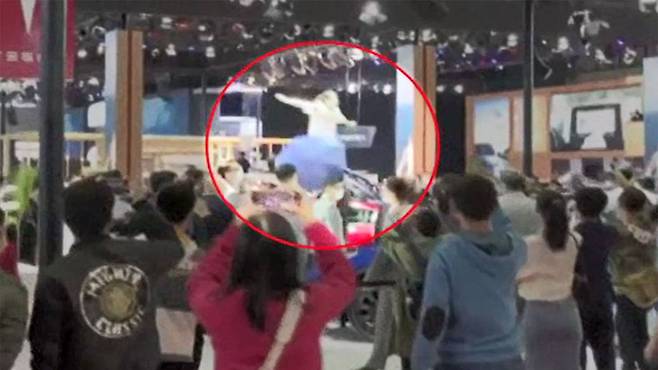 세계 최대 자동차 전시 행사인 중국 상하이 모터쇼 현장에서 한 여성이 테슬라 차량 위에 올라가 결함을 주장하며 기습 시위를 벌였습니다.